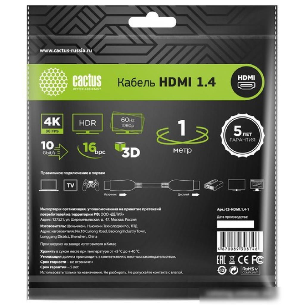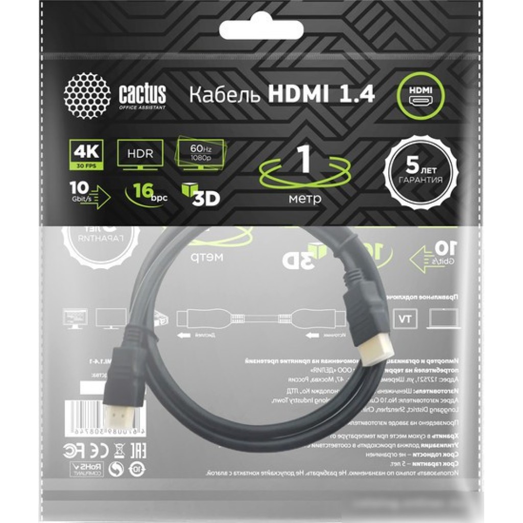 Кабель CACTUS HDMI - HDMI CS-HDMI.1.4-1 (1 м, черный)