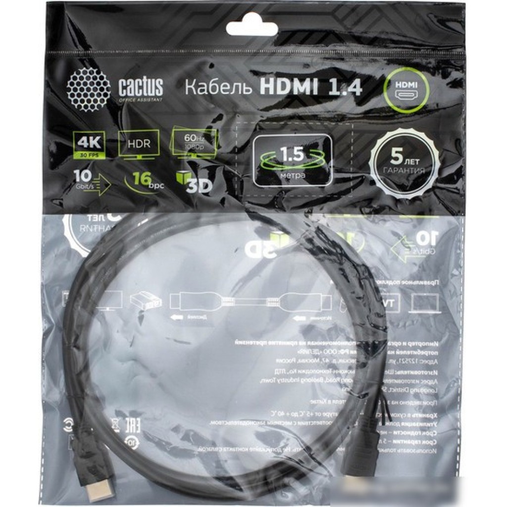 Кабель CACTUS HDMI - HDMI CS-HDMI.1.4-1.5 (1.5 м, черный)