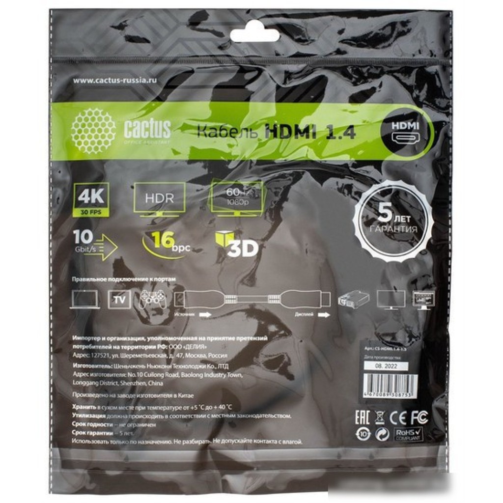 | Информация | --Текст описания составлен при помощи искусственного интеллекта. - Кабель CACTUS HDMI - HDMI CS-HDMI.1.4-1.5 обеспечивает передачу видео и аудио с высоким качеством. - Подходит для подключения компьютера к av-аппаратуре. - Версия HDMI 1.4 обеспечивает поддержку разрешения до 1080p и передачу 3D видео. - Длина кабеля 1.5 метра обеспечивает удобство при подключении устройств. - Одинаковый разъем с двух сторон делает его универсальным и удобным в использовании. |
