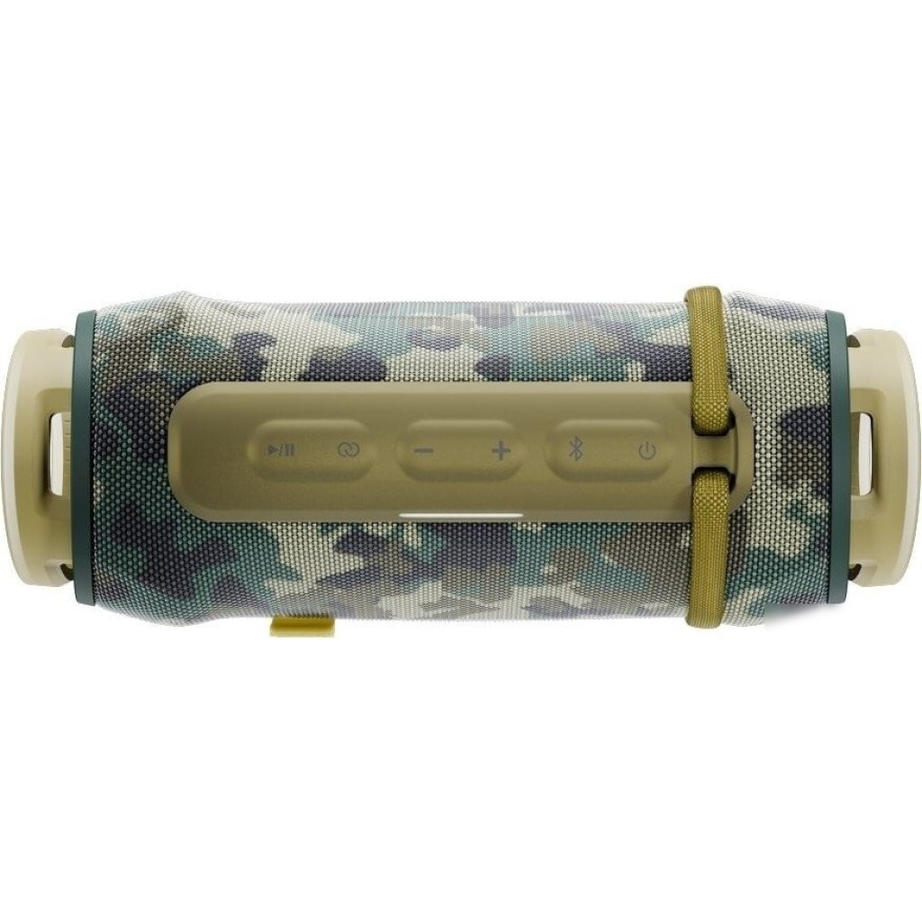 Корпус колонки выполнен из прочного пластика и обтянут тканью, что придает ей стильный и современный вид. Дополнительная влагозащита по стандарту IP67 позволяет использовать колонку на улице в любых погодных условиях. Переносить устройство удобно благодаря ремешку.