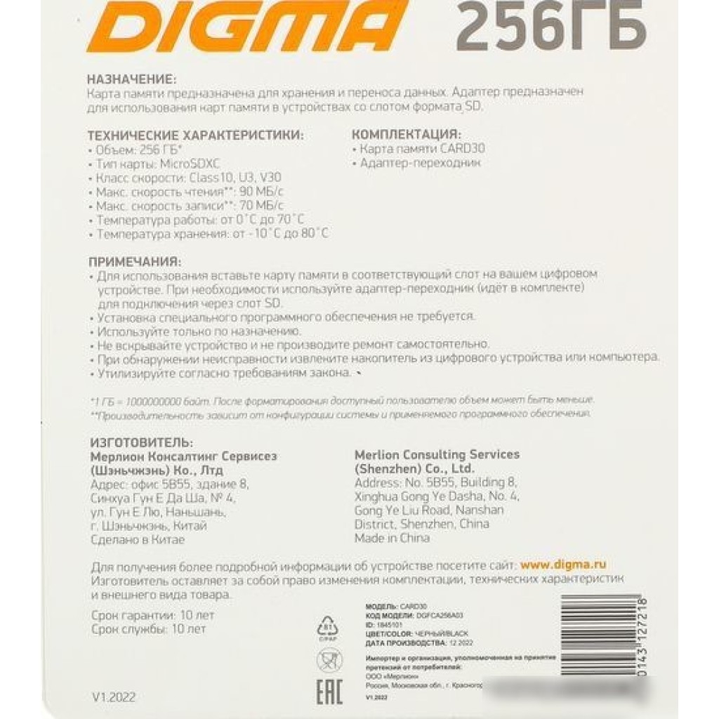 Карта памяти Digma MicroSDXC Class 10 Card30 DGFCA256A03