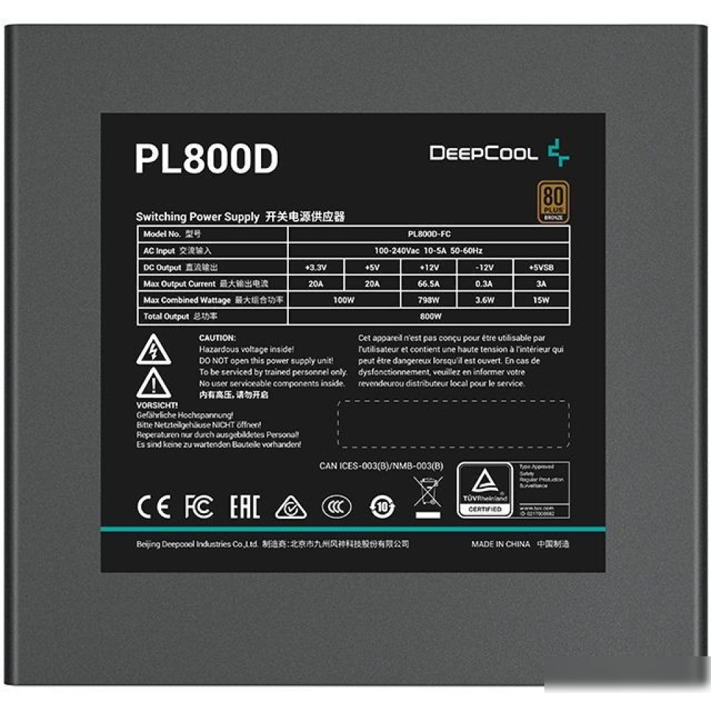 | Информация | --Текст описания составлен при помощи искусственного интеллекта. - Блок питания DeepCool PL800D обеспечивает надежное питание для геймерских систем. - Сертифицирован по стандарту 80 PLUS бронзовый, что гарантирует эффективную работу и экономию энергии. - Активный PFC обеспечивает стабильное и эффективное использование электроэнергии. - Система охлаждения с вентилятором размером 120 мм обеспечивает надежное охлаждение блока питания. - Блок питания имеет разнообразные разъемы, включая SATA, PCIe 6+2 pin, IDE 4 pin и CPU 4+4 pin, что делает его универсальным и подходящим для различных конфигураций компьютеров. - Совместим с материнскими платами стандарта ATX12V 3.0 и имеет высокую мощность 800 Вт для обеспечения стабильной работы компонентов. |