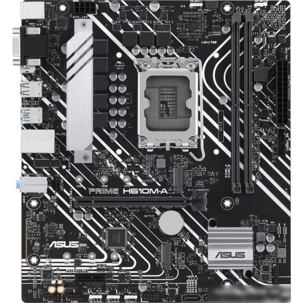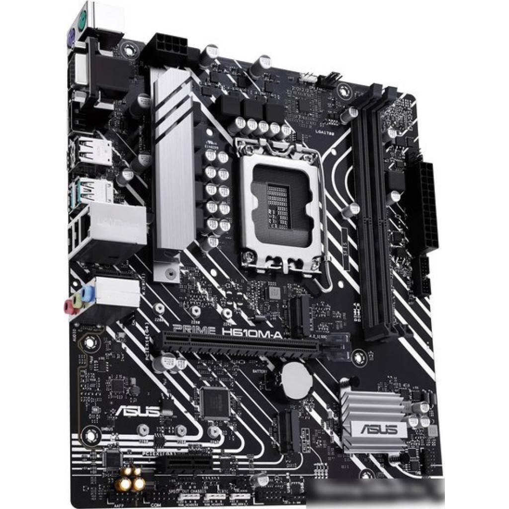mATX, сокет Intel LGA1700, чипсет Intel H610, память 2xDDR5 до 5600 МГц, слоты: 1xPCIe x16, 1xPCIe x1, 2xM.2