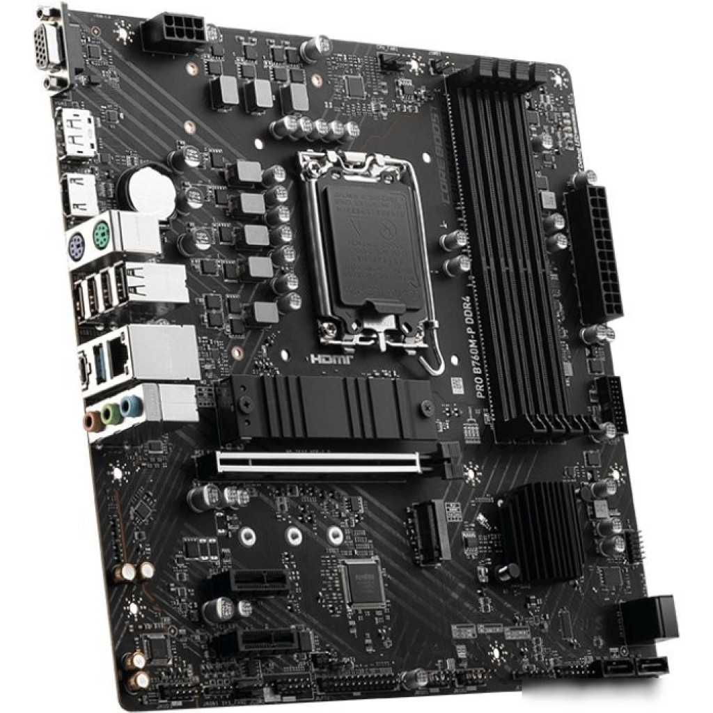 mATX, сокет Intel LGA1700, чипсет Intel B760, память 4xDDR4 до 4800 МГц, слоты: 1xPCIe x16 4.0, 2xPCIe x1, 2xM.2