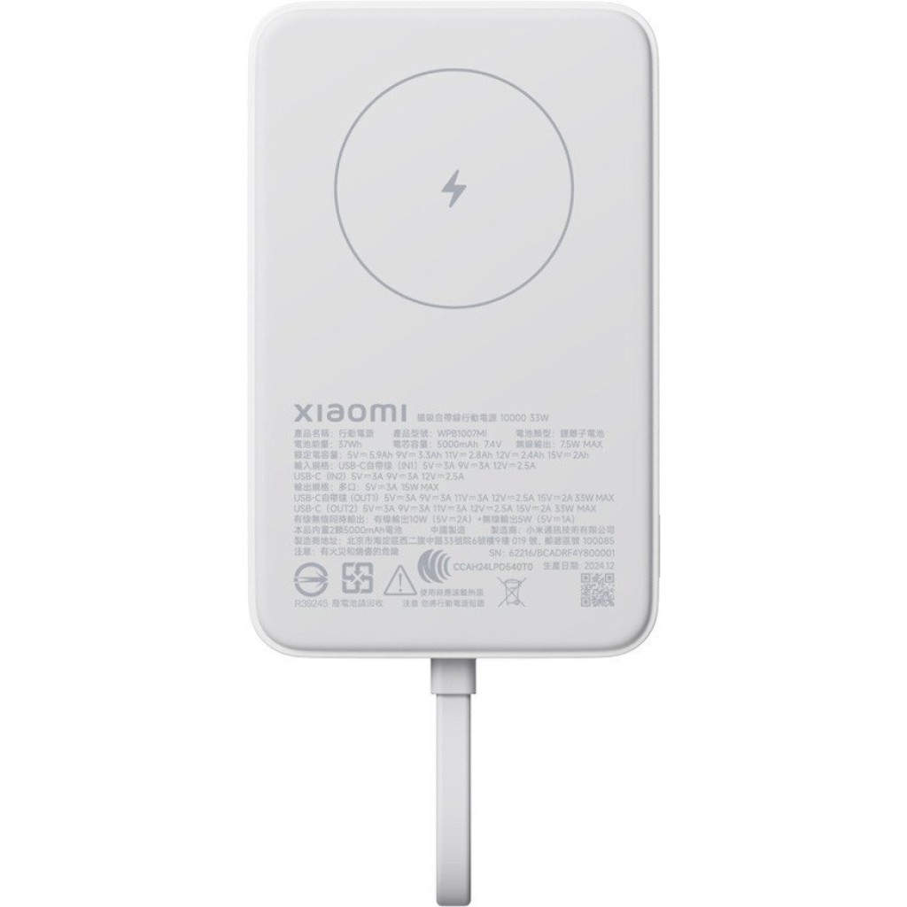 | Информация | -Xiaomi 33W Magnetic Power Bank 10000 (Integrated Cable) - это современное портативное зарядное устройство, сочетающее в себе проводную и беспроводную зарядку, что делает его универсальным помощником для ежедневных нужд. Компактный корпус выполнен в тёмном цвете с минималистичным дизайном, а круглый значок с молнией на верхней панели указывает на область беспроводной зарядки. -Встроенный литий-ионный аккумулятор ёмкостью 10000 мА·ч обеспечивает надёжную подзарядку различных мобильных устройств, включая смартфоны, планшеты и наушники. Благодаря поддержке быстрой зарядки мощностью до 33 Вт через USB Type-C и наличию интегрированного кабеля, устройство подходит для быстрой и удобной подзарядки в любых условиях. -Магнитная беспроводная зарядка мощностью до 7.5 Вт позволяет использовать power bank с устройствами, поддерживающими стандарт Qi, а также с аксессуарами с поддержкой MagSafe. Это делает гаджет особенно удобным для пользователей современных смартфонов, которые ценят простоту использования и отсутствие лишних проводов. -Компактные размеры (109 x 68.5 x 19.8 мм) и вес 238 г позволяют легко носить устройство с собой в сумке или кармане, а наличие индикаторов заряда упрощает контроль уровня энергии. Устройство отличается высокой надёжностью и стильным внешним видом, что делает его отличным выбором для активных пользователей. |