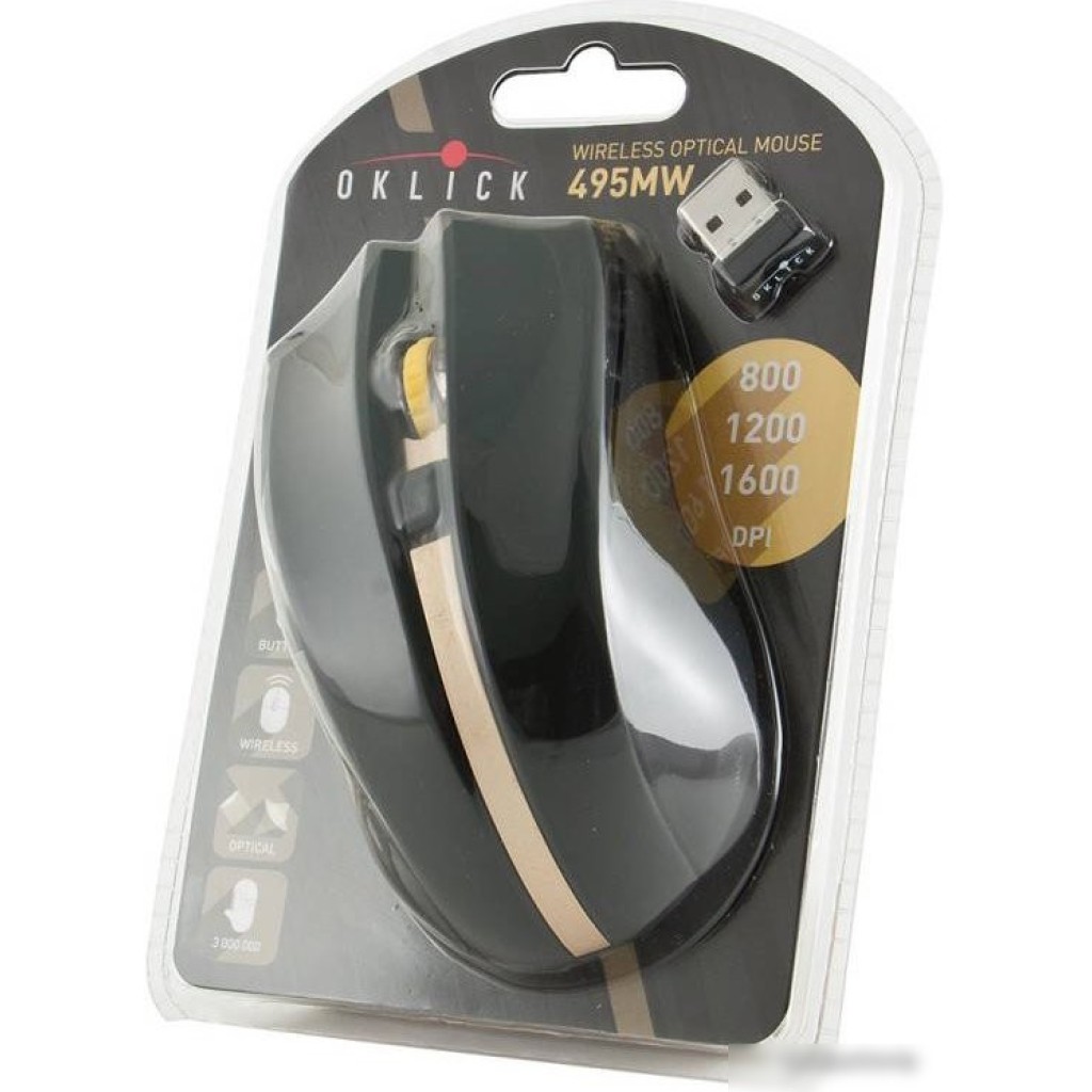 полноразмерная мышь, беспроводная радио, сенсор оптический 1600 dpi, 6 кнопок, колесо с нажатием, цвет черный/желтый/золотистый