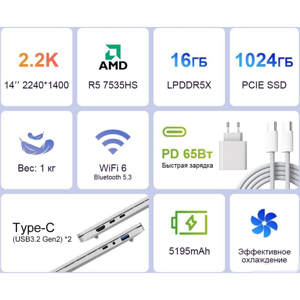14.0" 2240 x 1400, IPS, 60 Гц, AMD Ryzen 5 7535HS, 16 ГБ LPDDR5X, SSD 1024 ГБ, видеокарта встроенная, Windows 11 Pro, цвет крышки серебристый