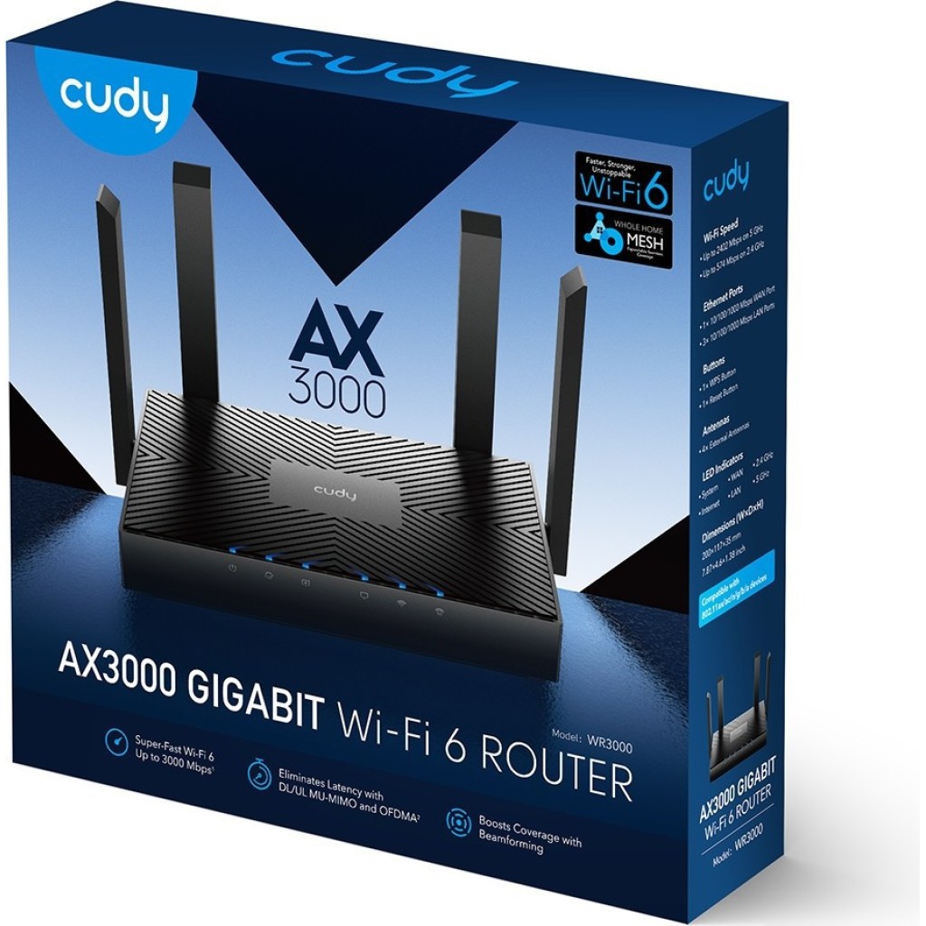 | Информация | --Текст описания переведен при помощи искусственного интеллекта. - WiFi 6 роутер с 5 потоками и четырьмя гигабитными портами, подходит для домашнего интернета до 1000 Мбит/с, подключения множества устройств и снижения задержки. - 1,3 ГГц двухъядерный процессор - 4-потоковый двухдиапазонный Wi-Fi 6 - 2402 Мбит/с + 574 Мбит/с Wi-Fi - 4 порта гигабитного Ethernet - 200 подключенных устройств - Покрывает 130 м- - Cudy Mesh, VPN-сервер и клиент - Приложение Cudy, облачное управление - (примечание: использовать только в крайнем случае) |