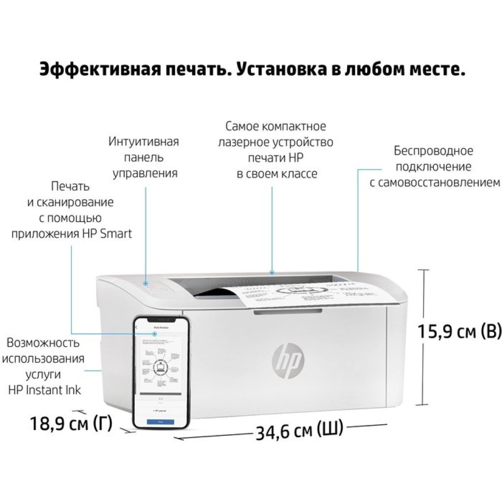 | Комплектация | Принтер HP LaserJet M111w; кабель питания; картридж HP LaserJet с черным тонером (ресурс: 500 страниц); плакат с инструкциями по настройке; справочное руководство; руководство по гарантии; рекламная листовка |